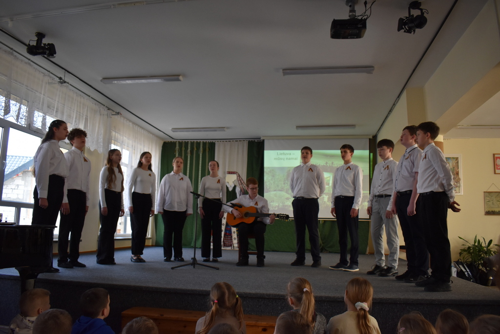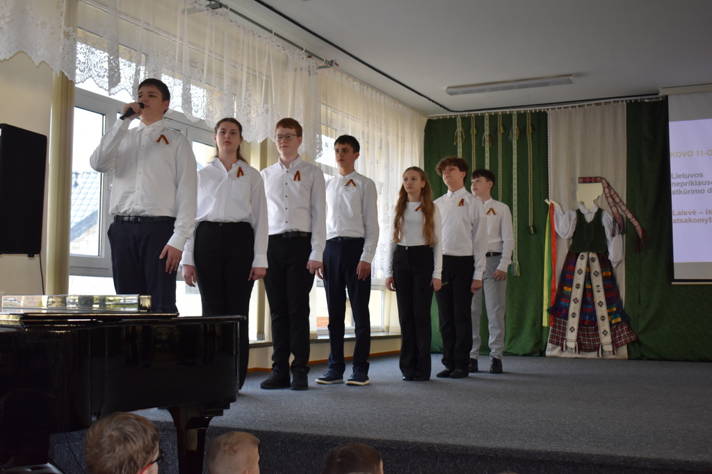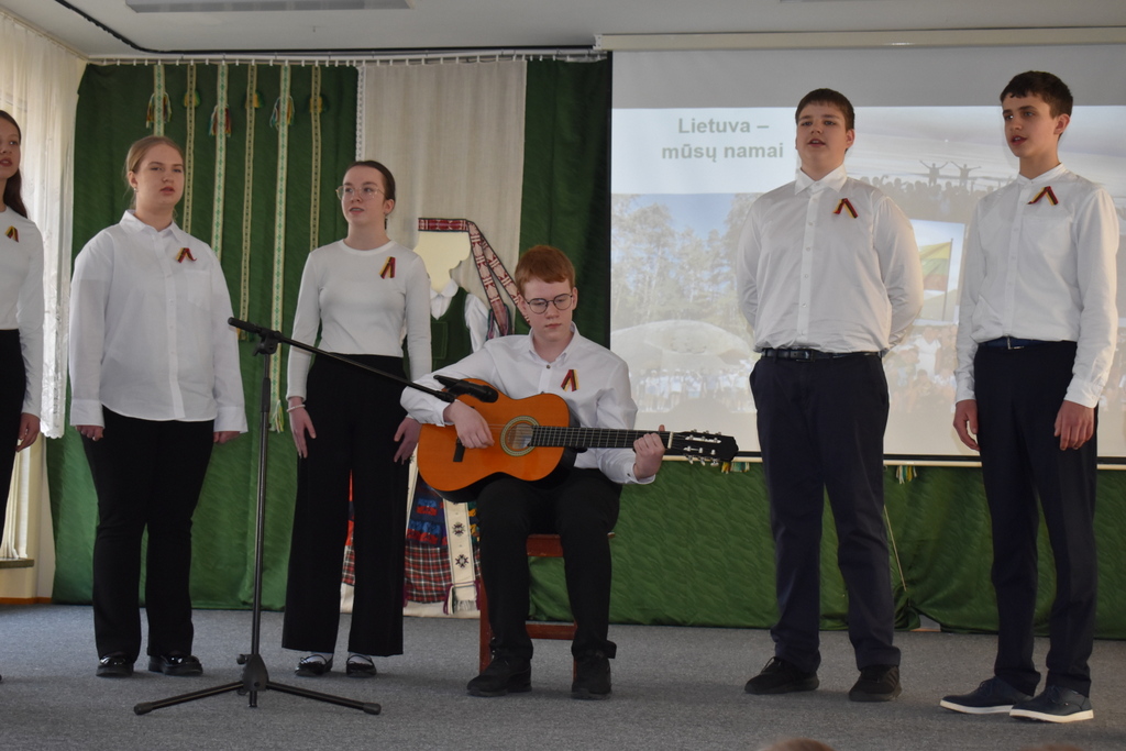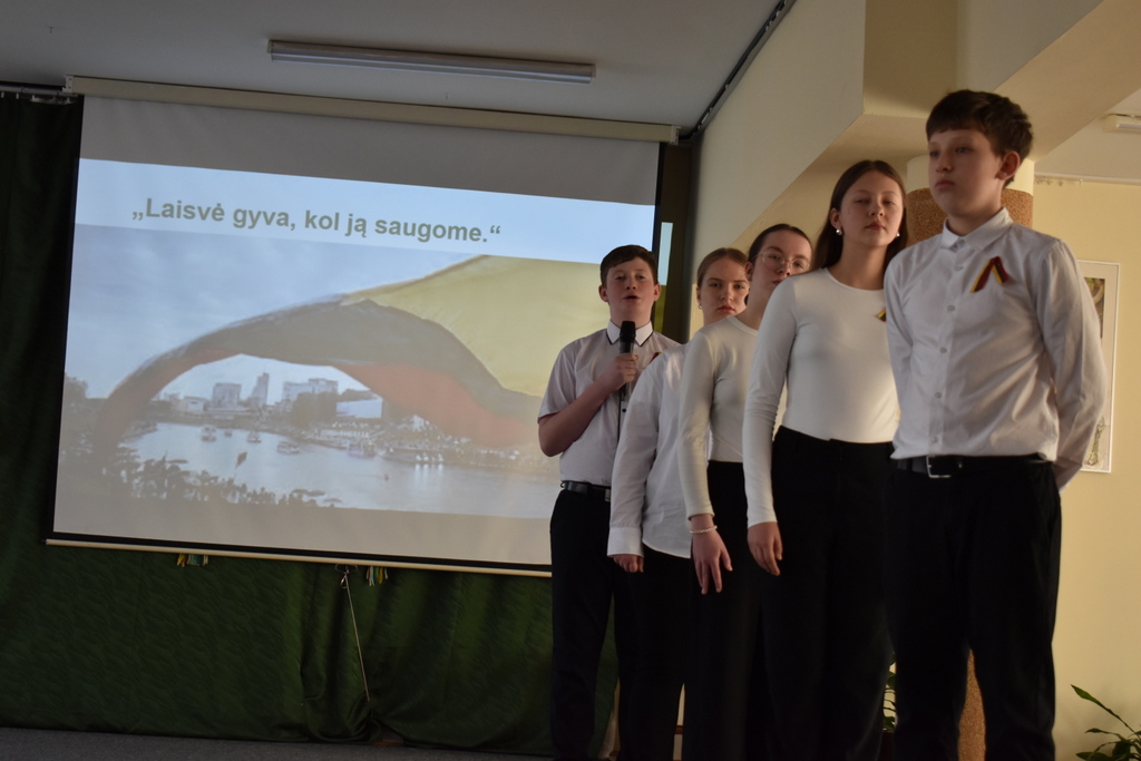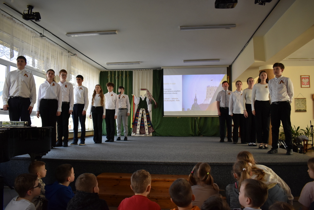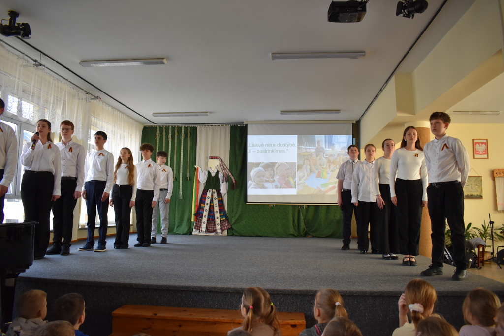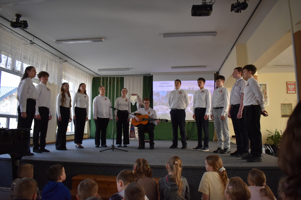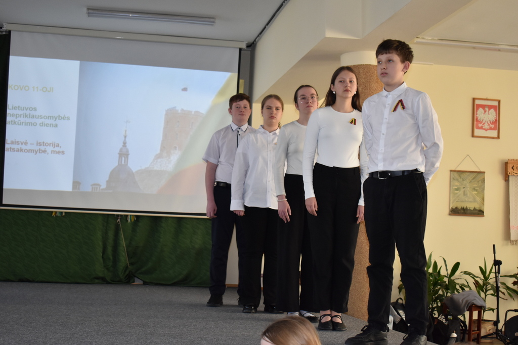 Uroczysty apel rozpoczął się od odśpiewania hymnu Litwy. Następnie uczniowie przypomnieli drogę Litwy do niepodległości. Usłyszeliśmy piękne piosenki i wiersze o miłości ojczyzny. Siódmoklasiści wyrazili również swoje myśli na temat współczesnej wolności. Podkreślili, że wolność zaczyna się od nas samych – szacunku do języka, historii, kultury i wzajemnego szanowania siebie i jest żywa, dopóki o nią dbamy.
