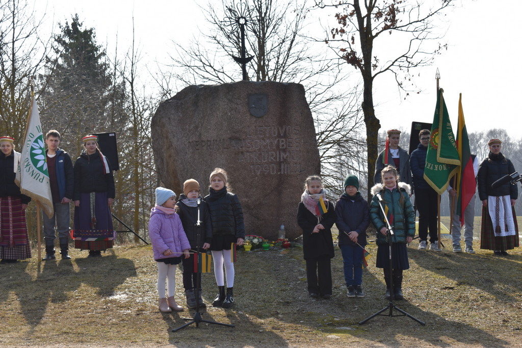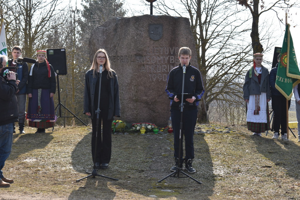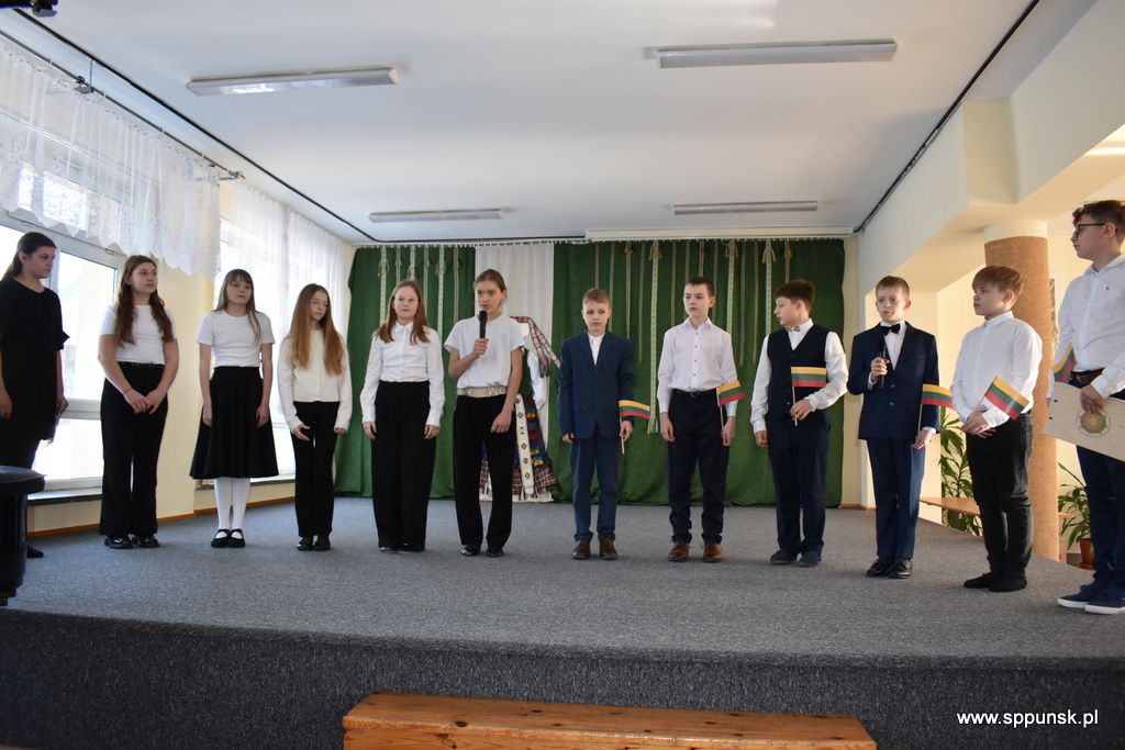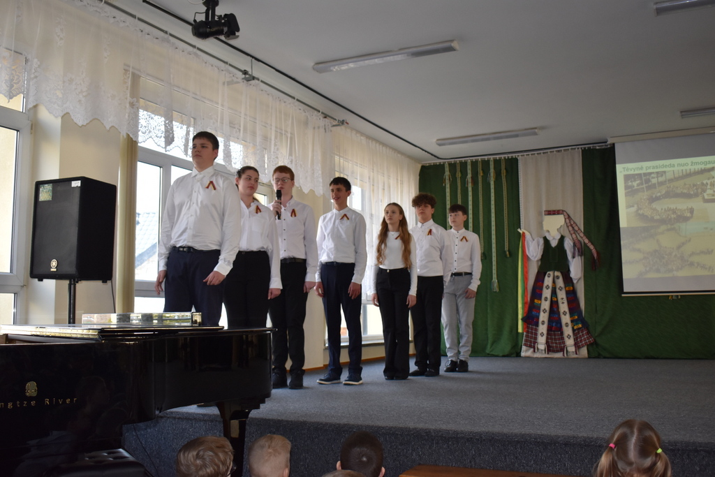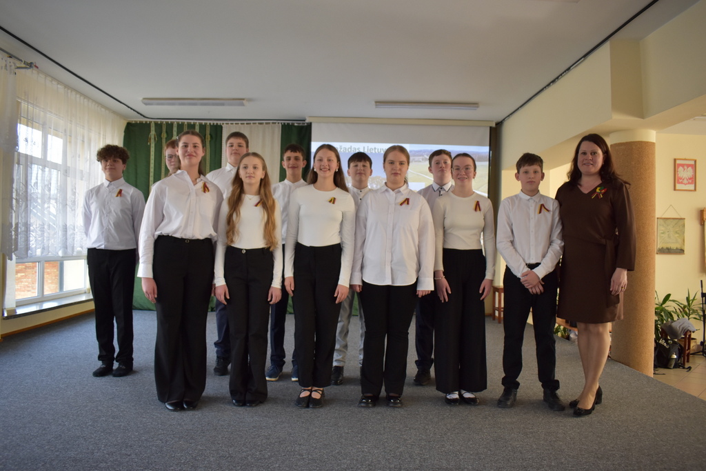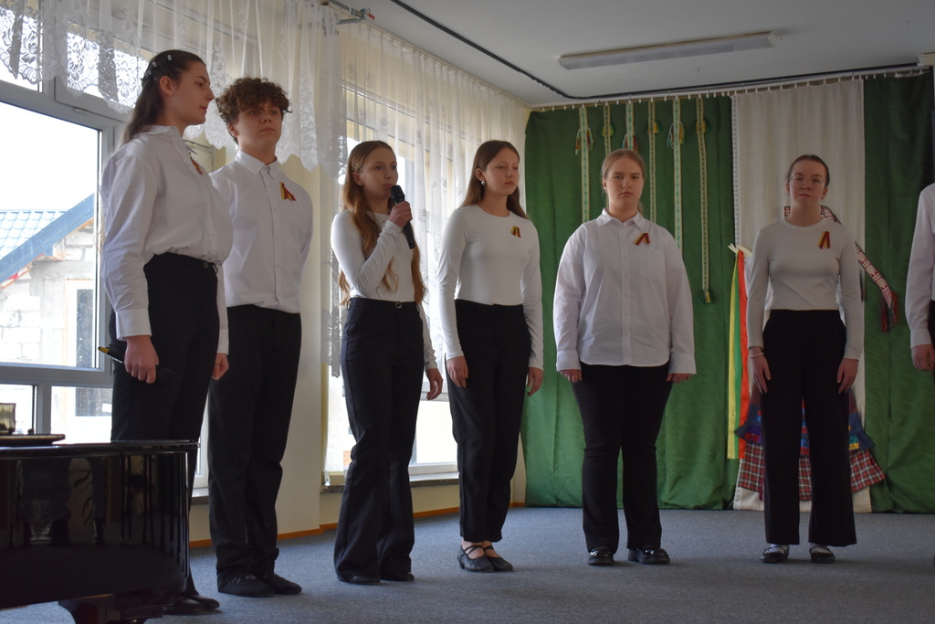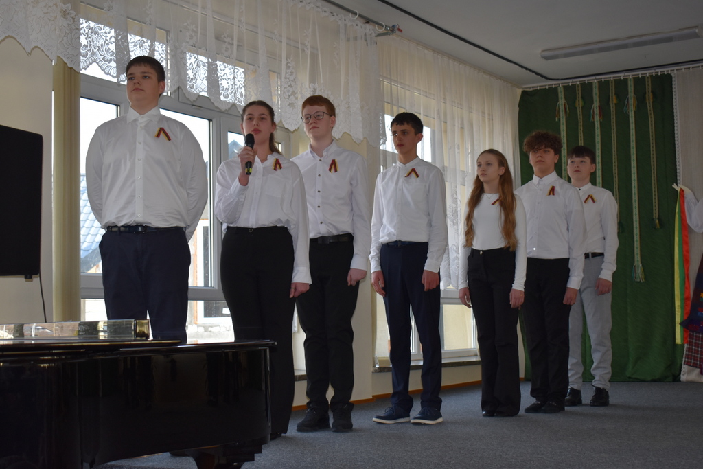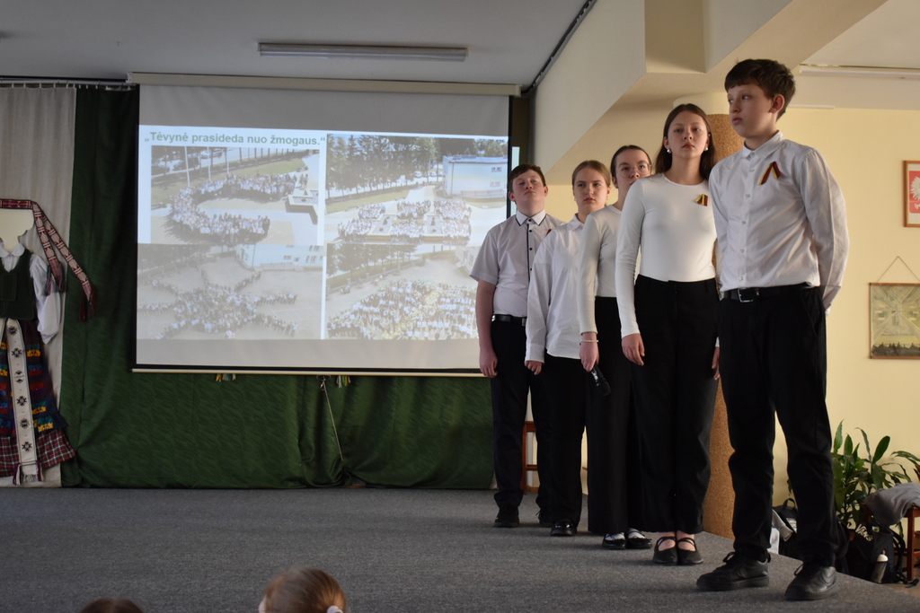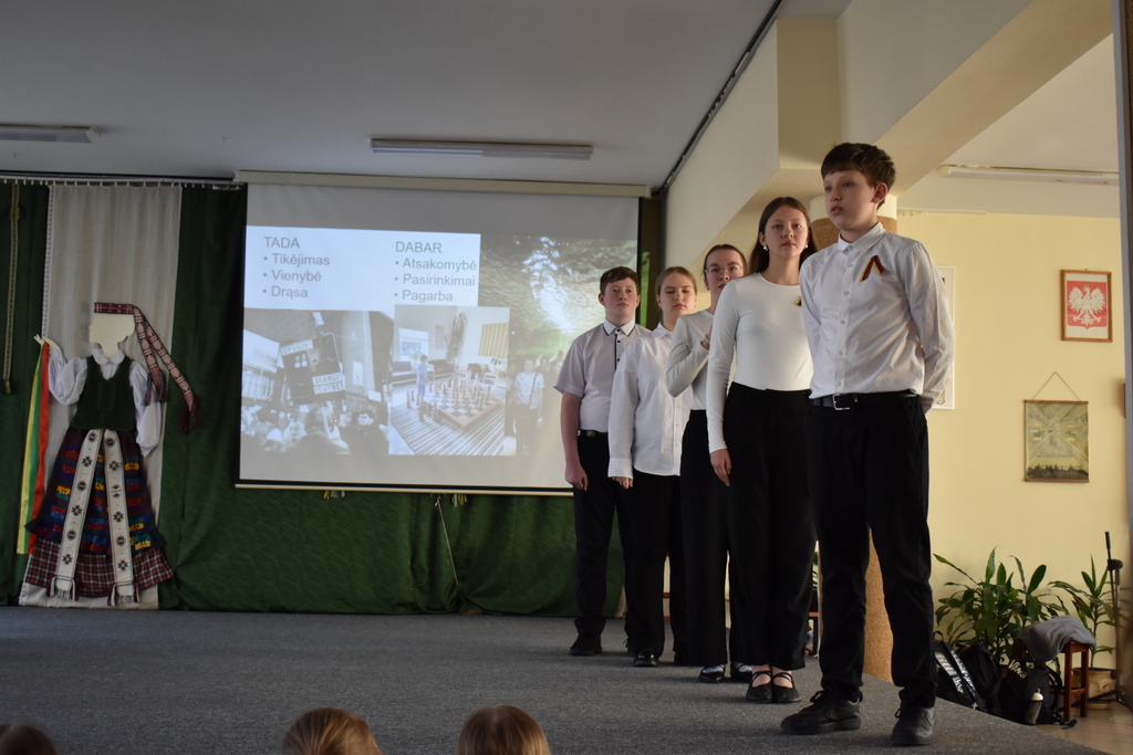Uroczysty apel rozpoczął się od odśpiewania hymnu Litwy. Następnie uczniowie przypomnieli drogę Litwy do niepodległości. Usłyszeliśmy piękne piosenki i wiersze o miłości ojczyzny. Siódmoklasiści wyrazili również swoje myśli na temat współczesnej wolności. Podkreślili, że wolność zaczyna się od nas samych – szacunku do języka, historii, kultury i wzajemnego szanowania siebie i jest żywa, dopóki o nią dbamy.