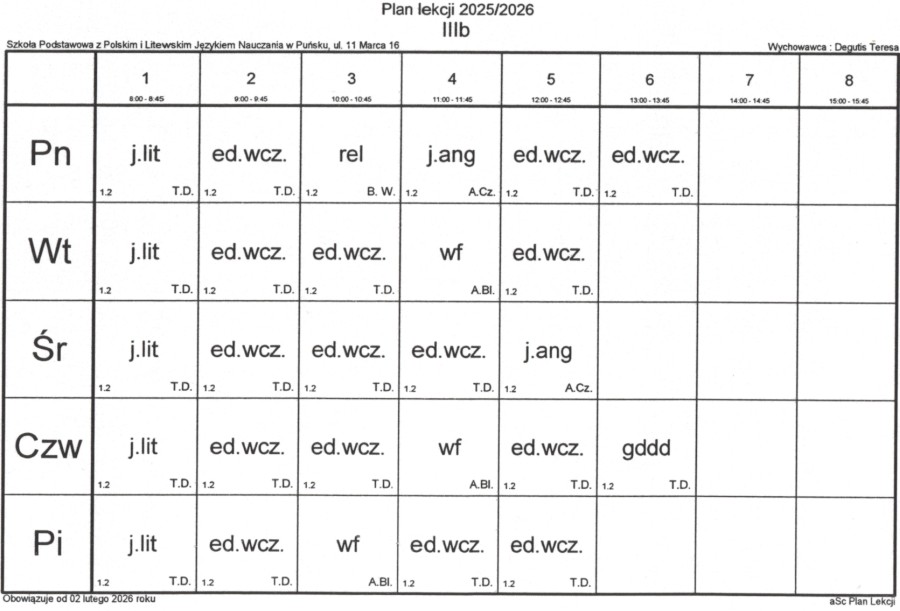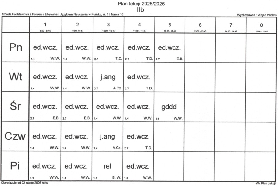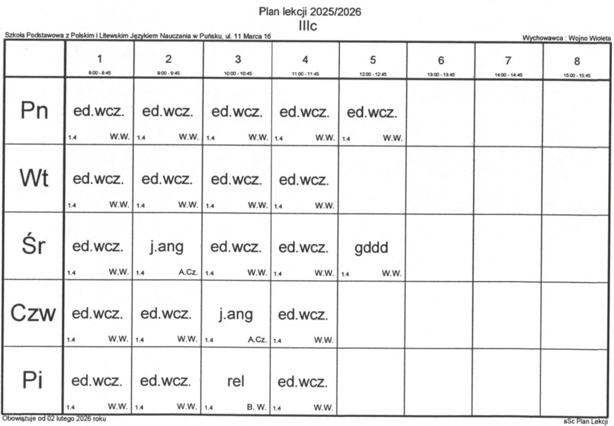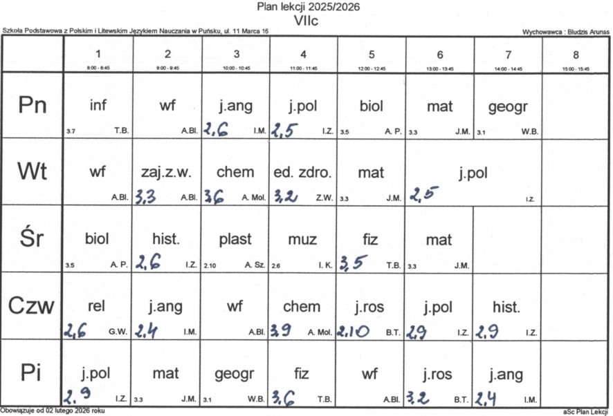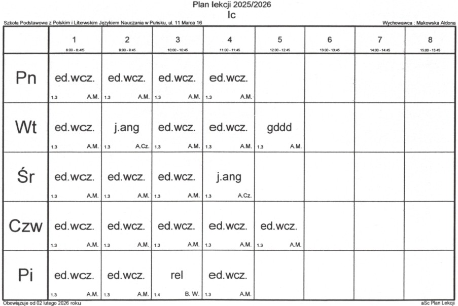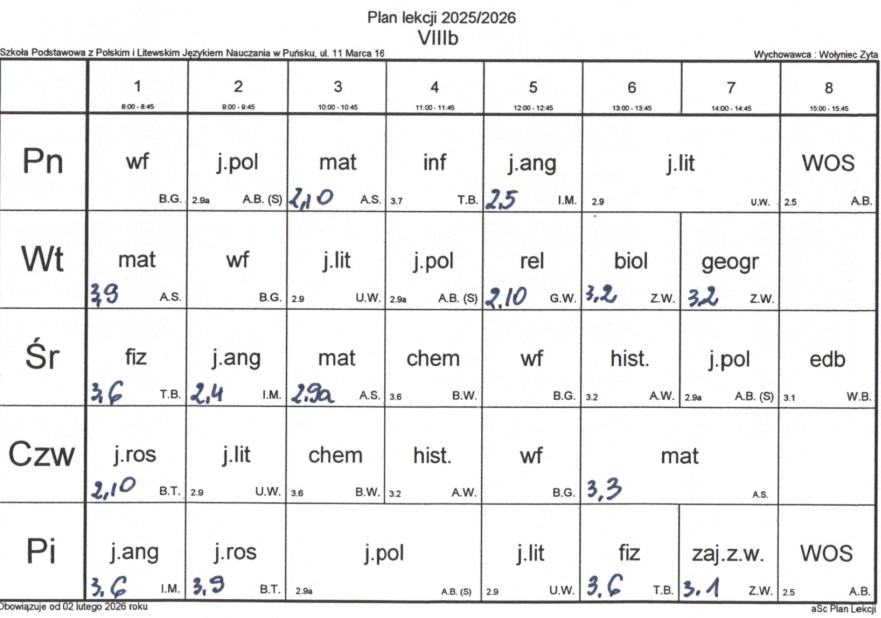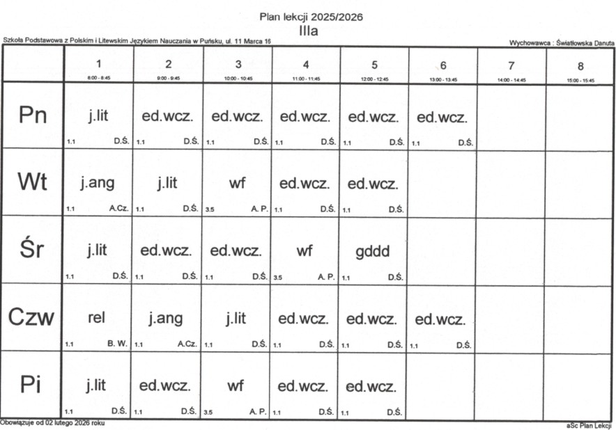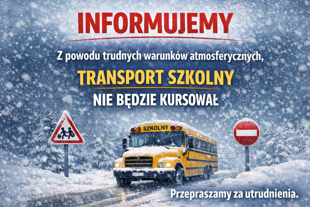 że w dniach 2–3 lutego 2026 r., z powodu trudnych warunków atmosferycznych, transport szkolny nie będzie kursował. Szkoła będzie funkcjonować w normalnym trybie, a lekcje odbędą się zgodnie z planem. Uczniowie, którzy nie przyjdą na lekcje, będą usprawiedliwieni.