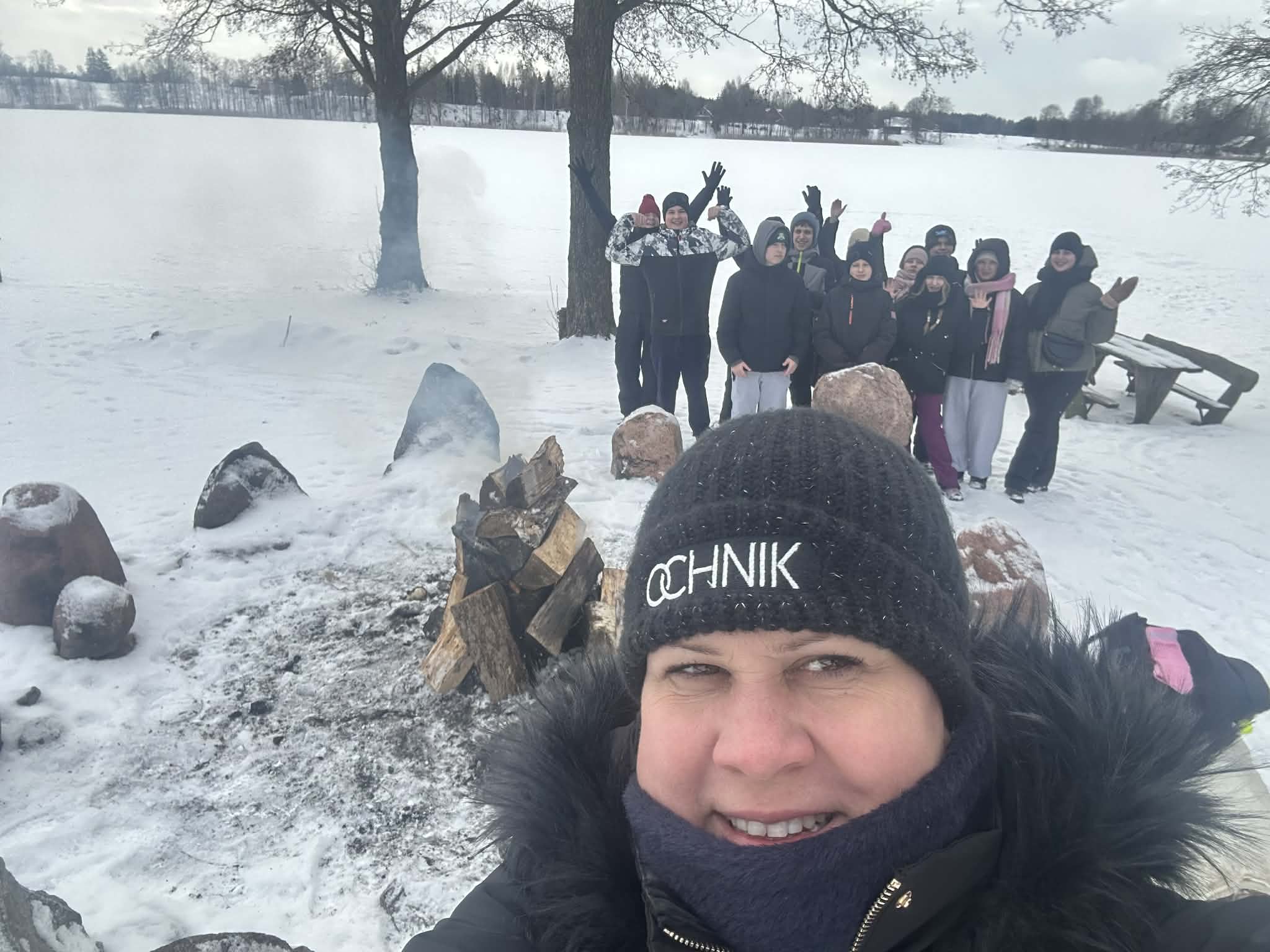 Jechaliśmy leśnymi drogami, potem pod górkę wśród pól i łąk, aż wróciliśmy nad jezioro w Šilainė. Tam czekało ognisko, kiełbaski i pianki oraz termos gorącej herbaty z malinami. Był również czas, aby pobawić się na śniegu, więc śnieżki poszły w ruch…