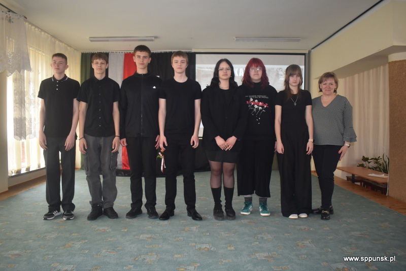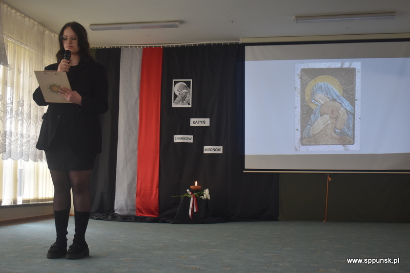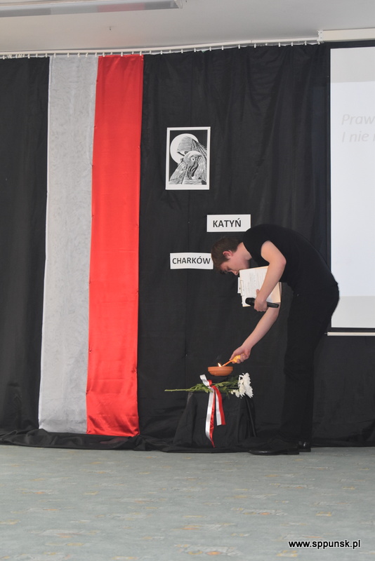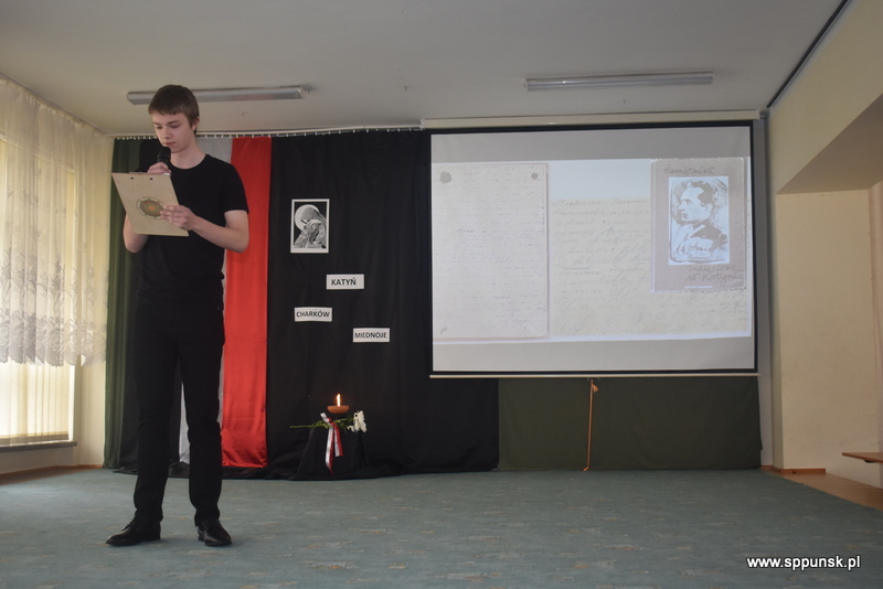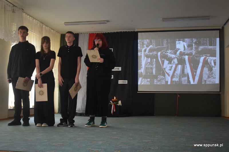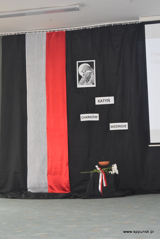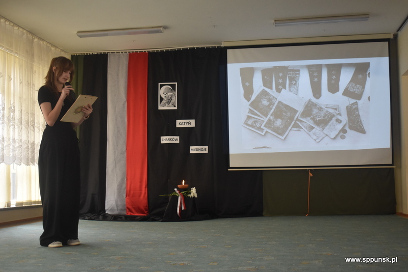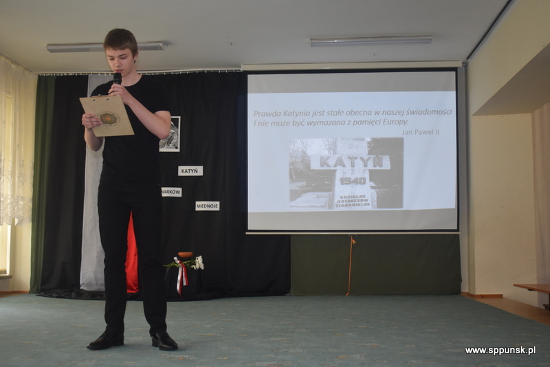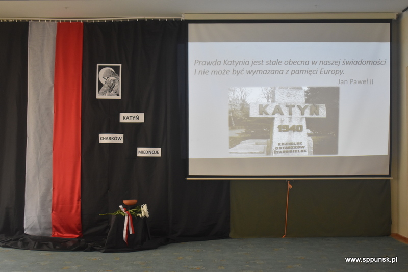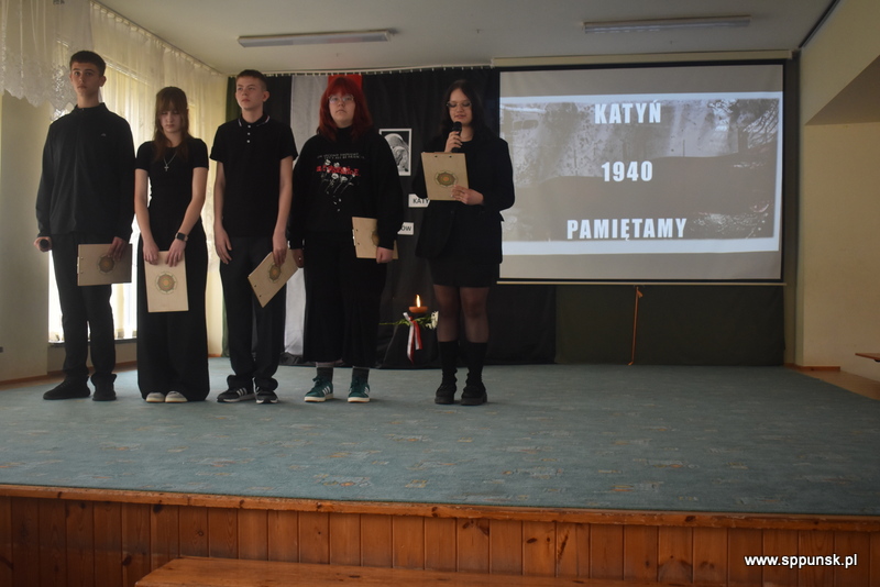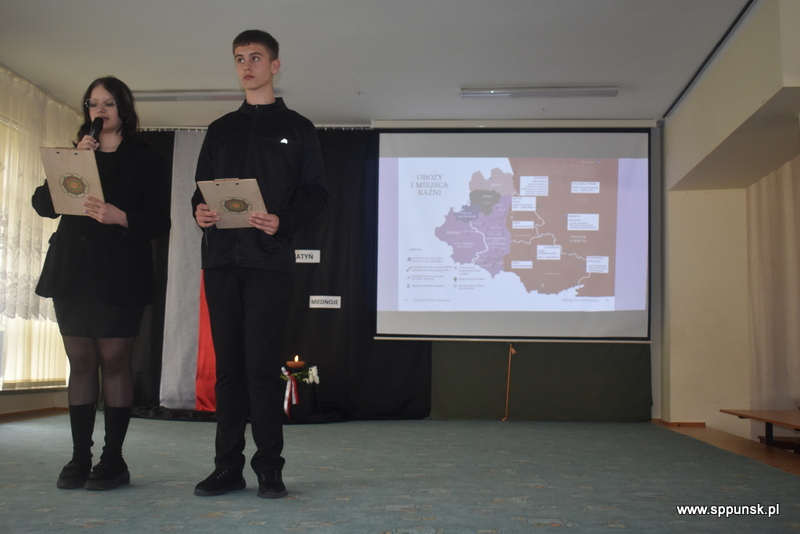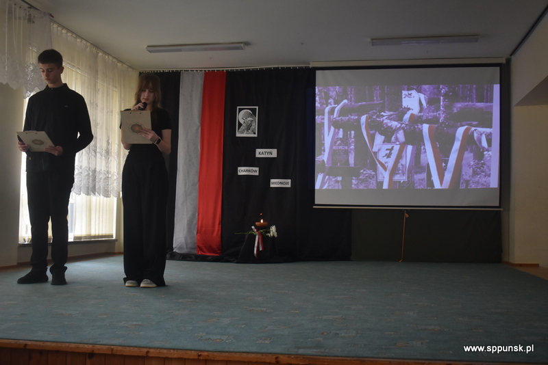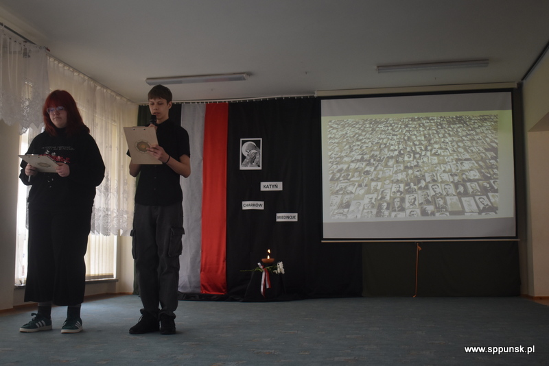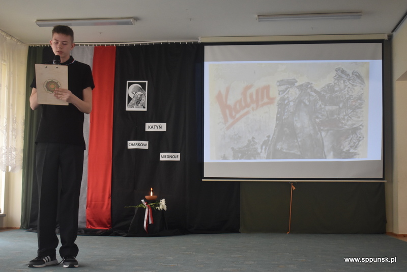 Uczniowie klasy VIII b przygotowali i przedstawili montaż słowno-muzyczny, który przybliżył uczniom i nauczycielom tło historyczne oraz skalę tej dramatycznej zbrodni przeciwko narodowi polskiemu. Wystąpieniom towarzyszyła prezentacja multimedialna. Była to poruszająca lekcja historii, która skłaniała do refleksji nad losem tysięcy niewinnych ludzi.